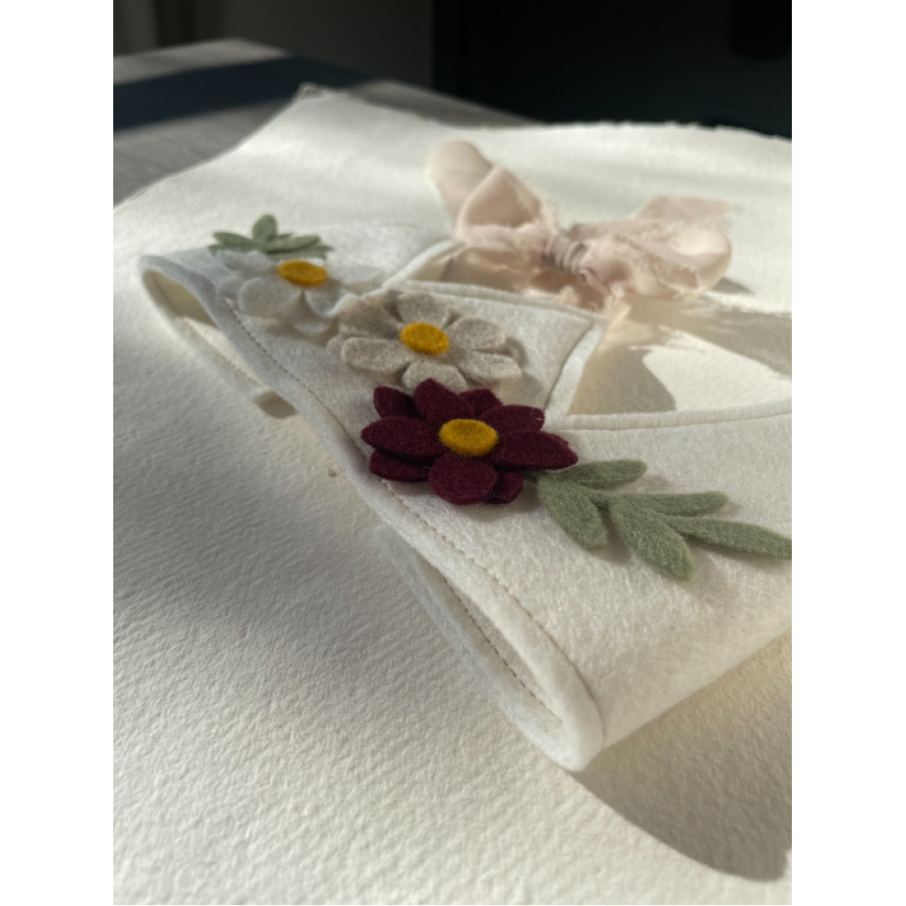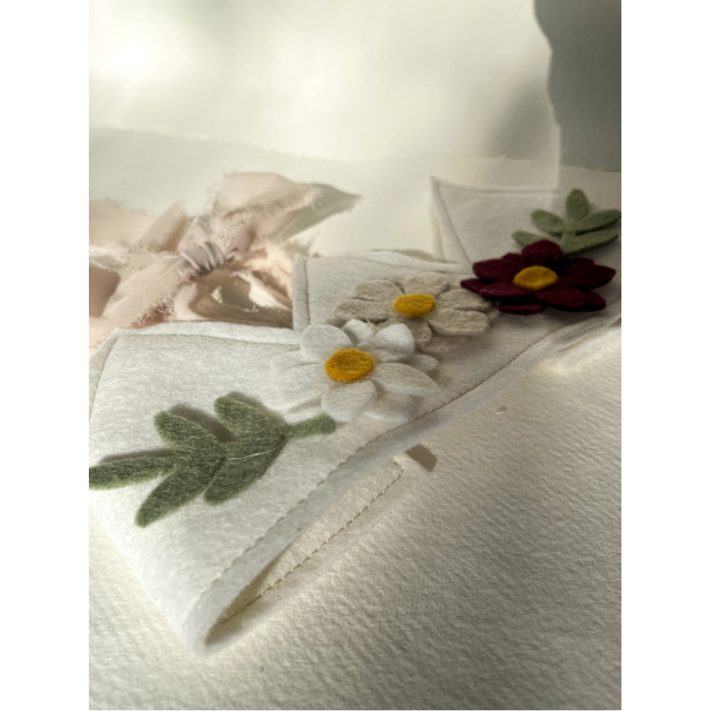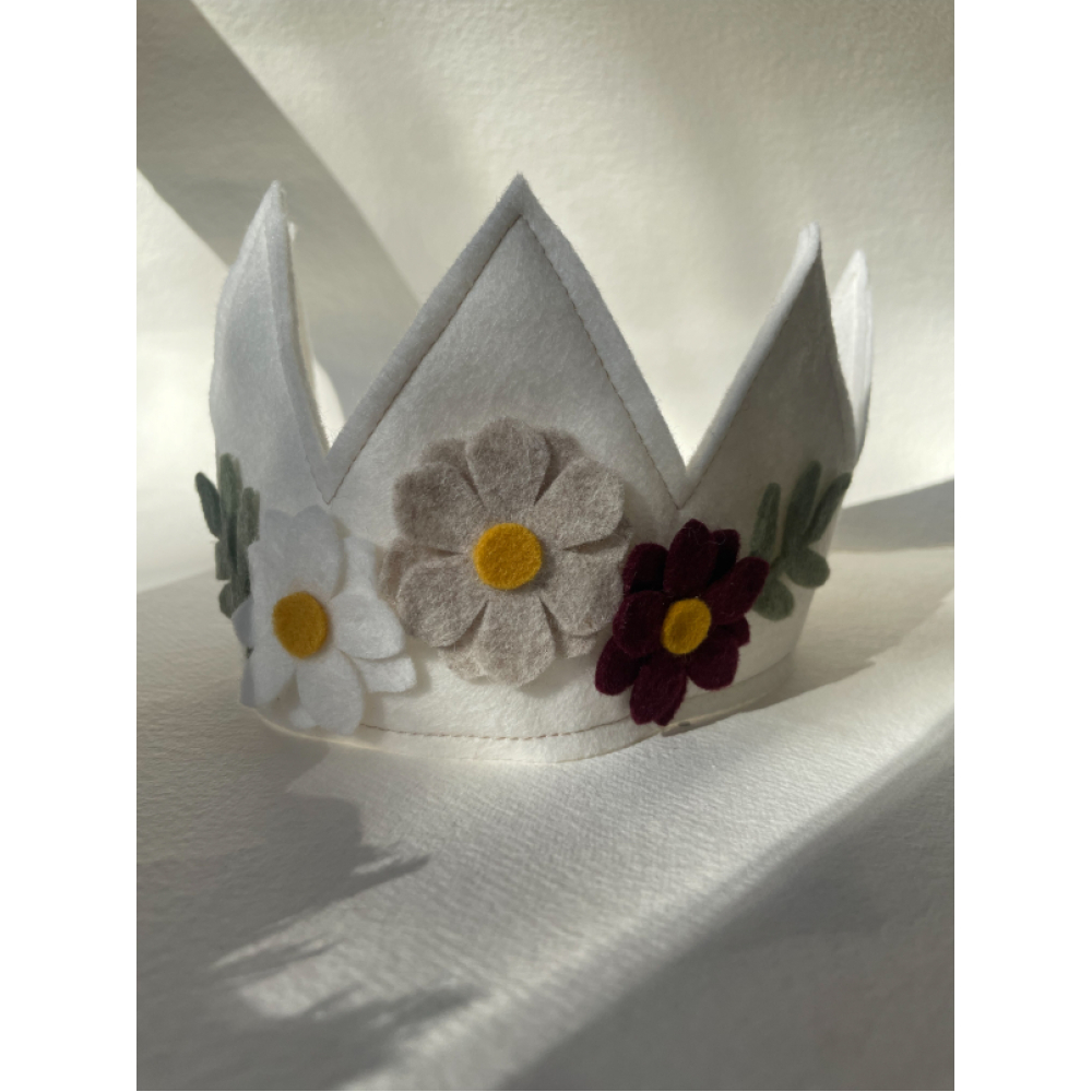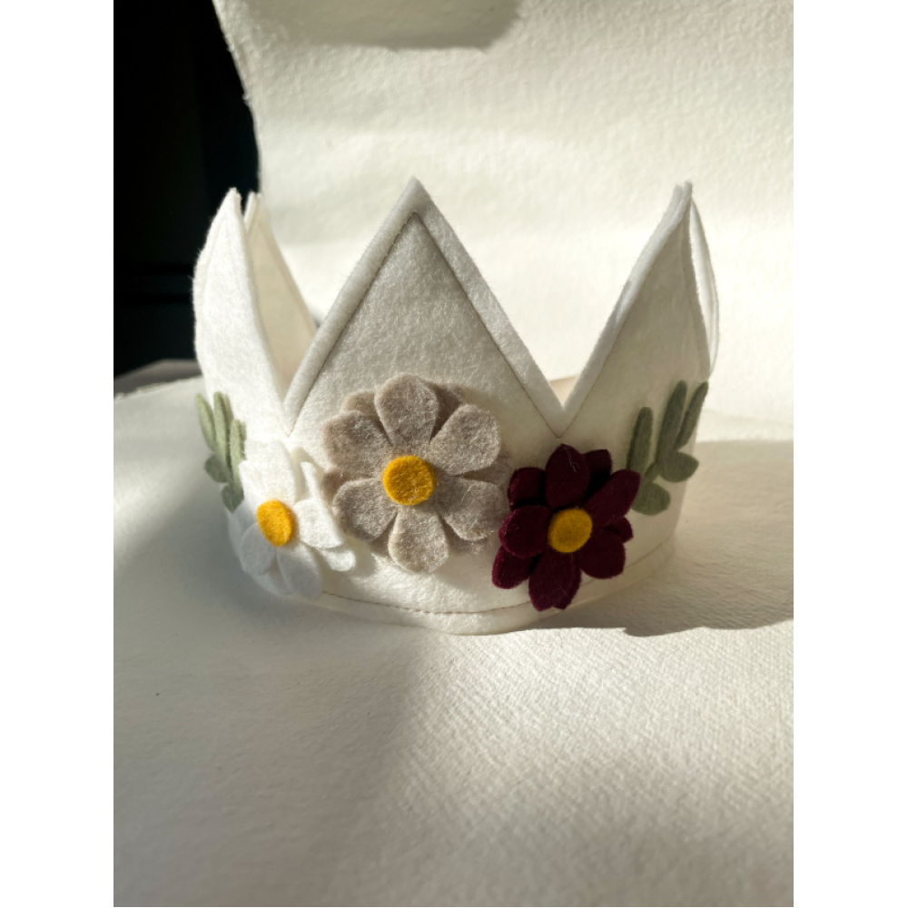 Dit vilten verjaardagskroontje heeft een mix van bordeaux-, wit- en beigegekleurde bloemen.