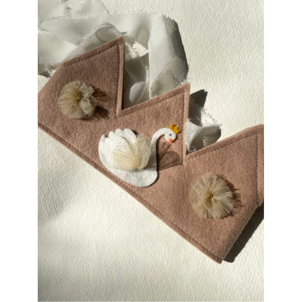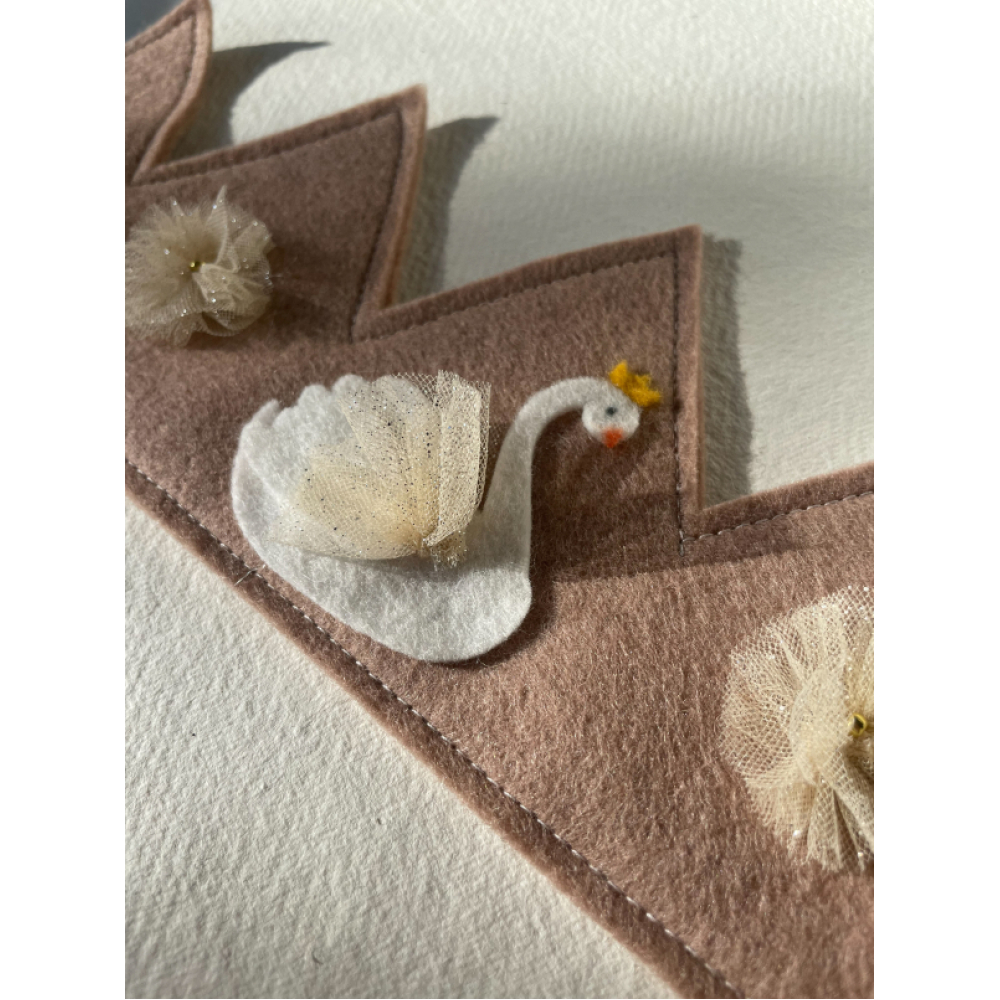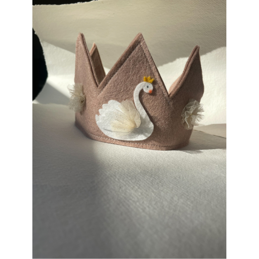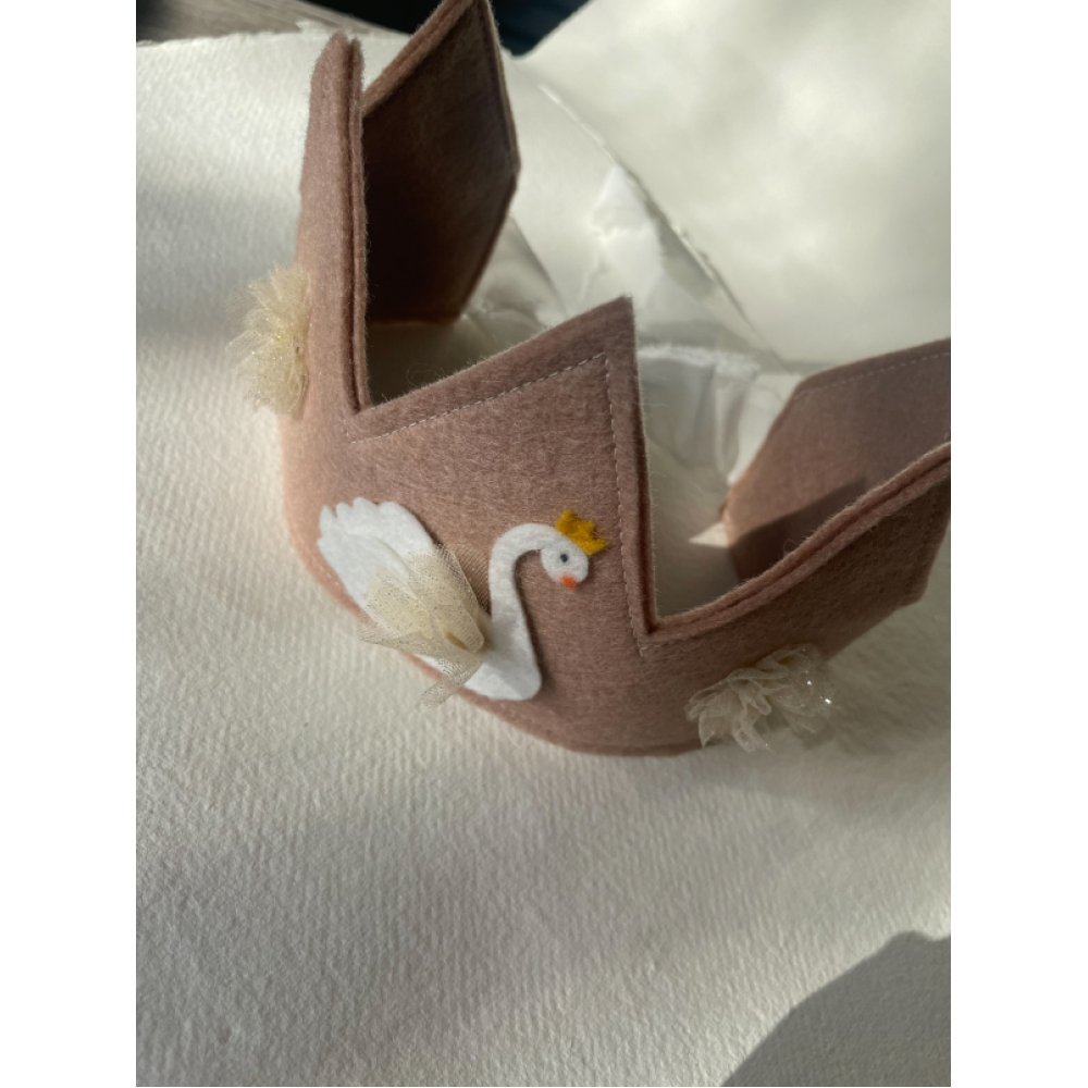 Dit roze vilten verjaardgskroontje heeft een wit zwaantje met met champagne kleurig glitter tule. De twee bloemetjes aan de zijkant maken het helemaal af!